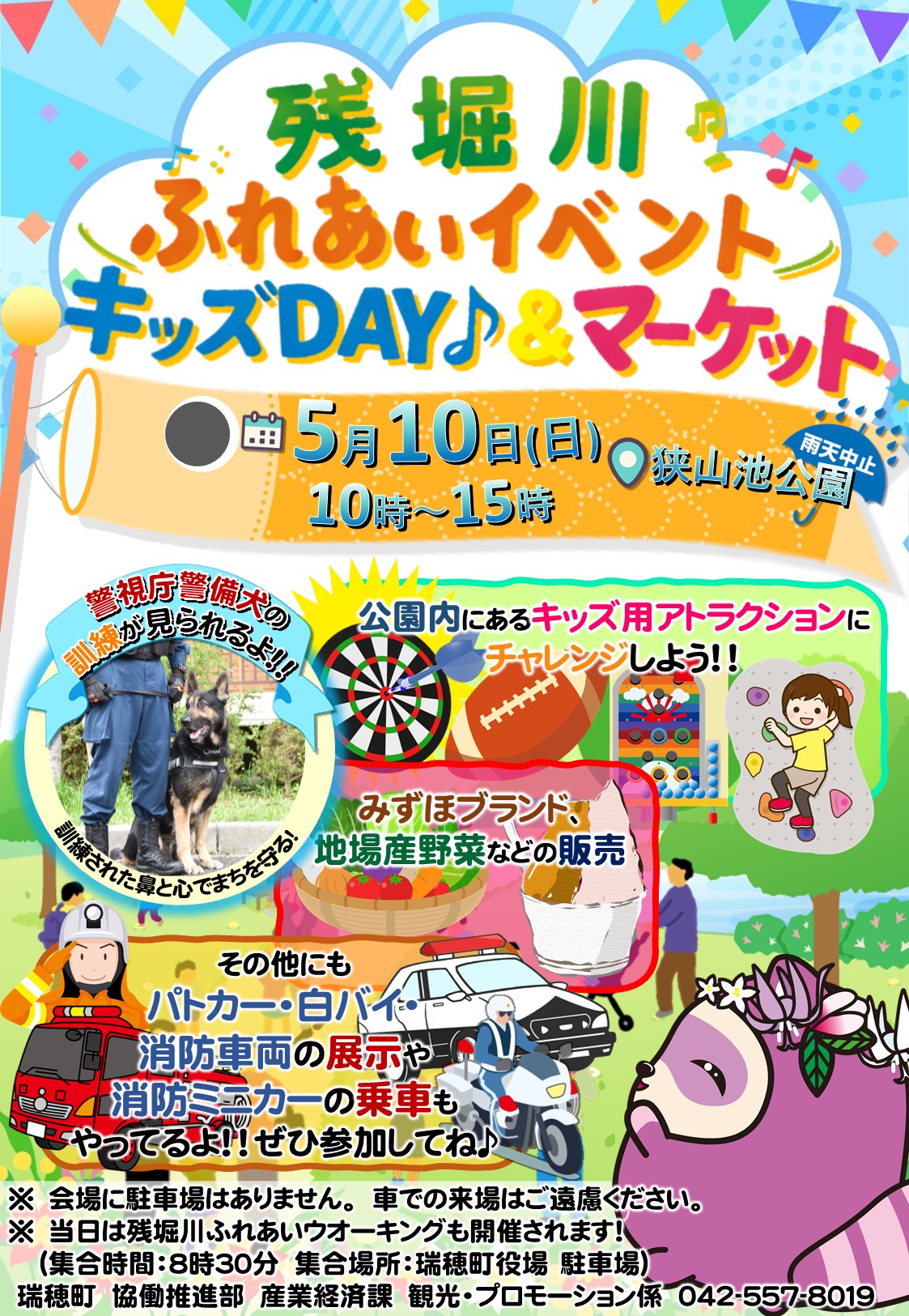 今年も皆さんが楽しみにしている「みずほブランド」・「地場産野菜」の販売、お子さんに好評の「キッズ用アトラクション」の体験、消防車両・パトカー・白バイの展示、消防ミニカーの乗車もできます。「キッチンカー」の出店もありますので、お食事もお楽しみください。