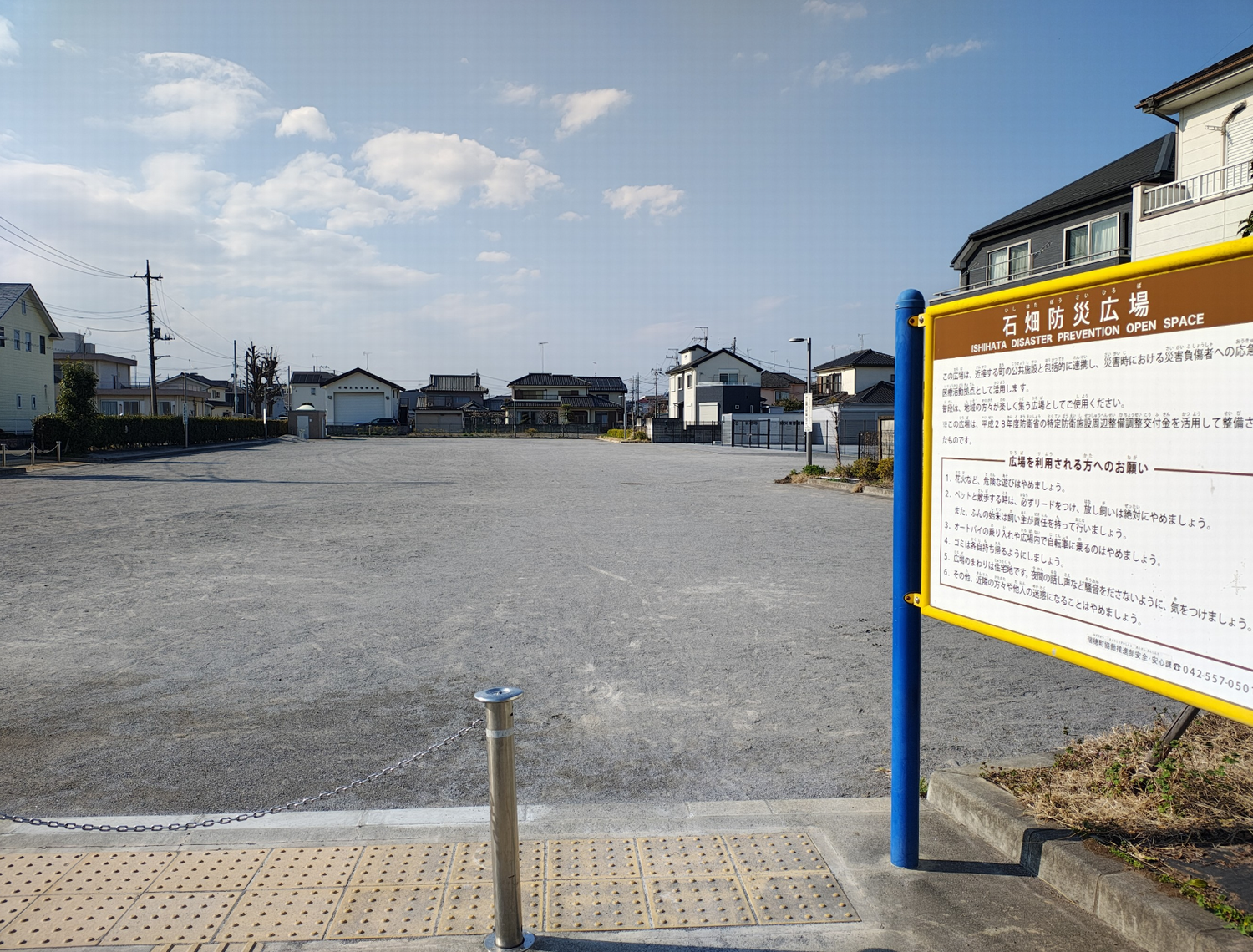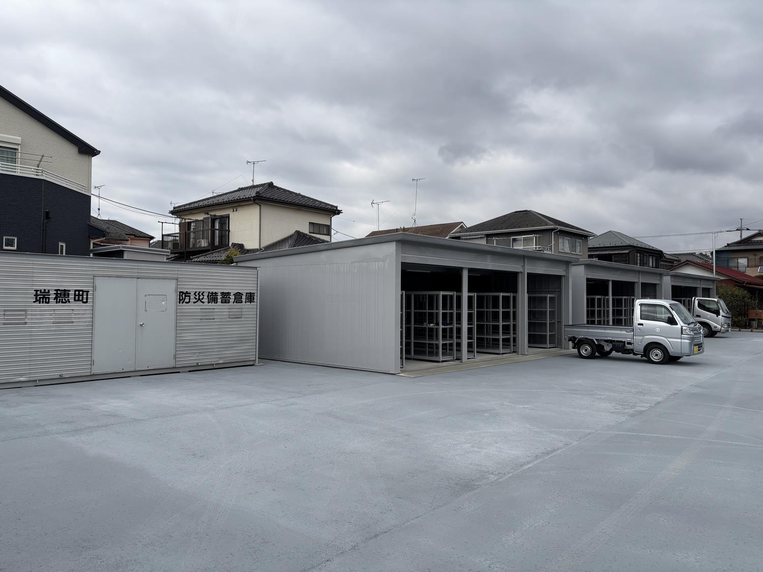 令和8年2月に、石畑防災広場拡張整備工事が完了しました。新しく整備された防災倉庫エリアには、災害に備えるための防災倉庫を3棟設置しています。