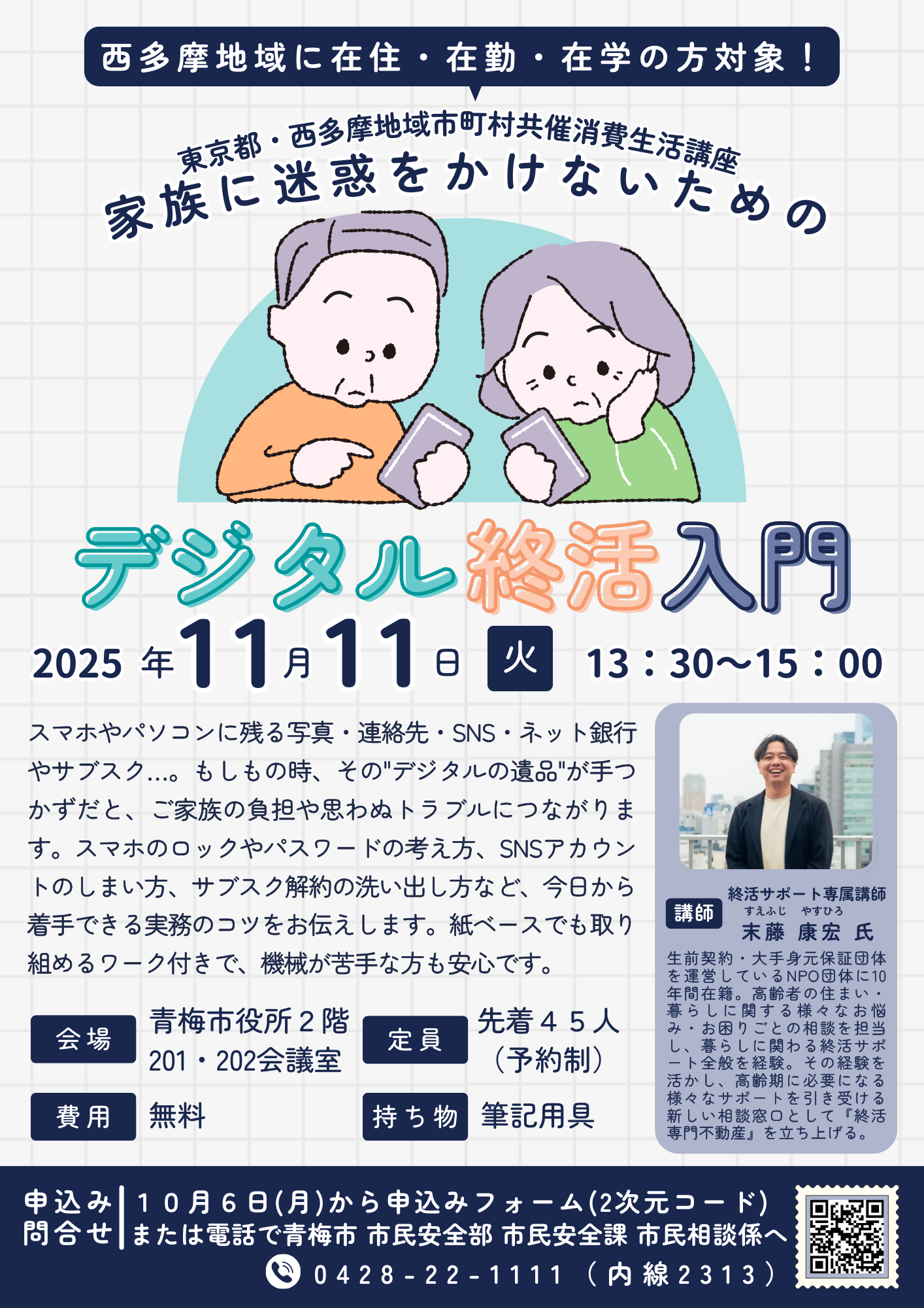 スマホやパソコンに残る写真・連絡先・SNS・ネット銀行やサブスク…。もしもの時、そのデジタルの遺品が手つかずだと、ご家族の負担や思わぬトラブルにつながります。スマホのロックやパスワードの考え方、SNSアカウントのしまい方、サブスクの解約の洗い出し方など、今日から着手できる実務のコツをお伝えします。紙ベースでも取り組めるワーク付きで、機械が苦手な方も安心です。