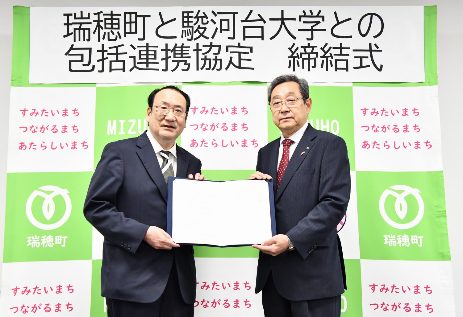 (左 駿河台大学大森一宏学長、右 山﨑瑞穂町長)